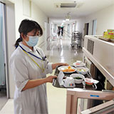 昼食の配膳、食事介助を実施します。患者さんに合わせた食事が提供されます。 管理栄養士と連携し患者さんが少しでも食事が進むよう話し合いをします。 お昼休憩は交替で取ります。 ナースステーション内の休憩室でお昼休憩をします。 手作り弁当の職員もいます。 |
