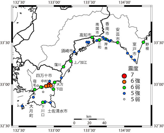 この地震の翌年、東京大学地震研究所の金井(1949)は、当時の高知県の全市町村の倒壊家屋数を調査し、全家屋数に対する倒壊家屋数の比率の分布図を示した。金井の原論文の図では家屋倒壊率を50%以上、20~50%、5~20%、1-5%、1%以下の5段階に区分して表示されているが、これは現在の気象庁震度の7、6強、6弱、5強、5弱の5段階にほぼ相当していると考えられる。金井の原図はまた地理的にゆがみがあるが、これを修正して書き改めたのが図1である。図1を一見して判るように、高知県の東部にある町村ほど震度が小さく、西に行くほど震度が大きくなる傾向があることが判る。ことに四万十市の中心地の中村では震度7であったと推定される。中村は四万十川と後川の間に立地していて地盤が軟弱であったために揺れが強く表れたのである。