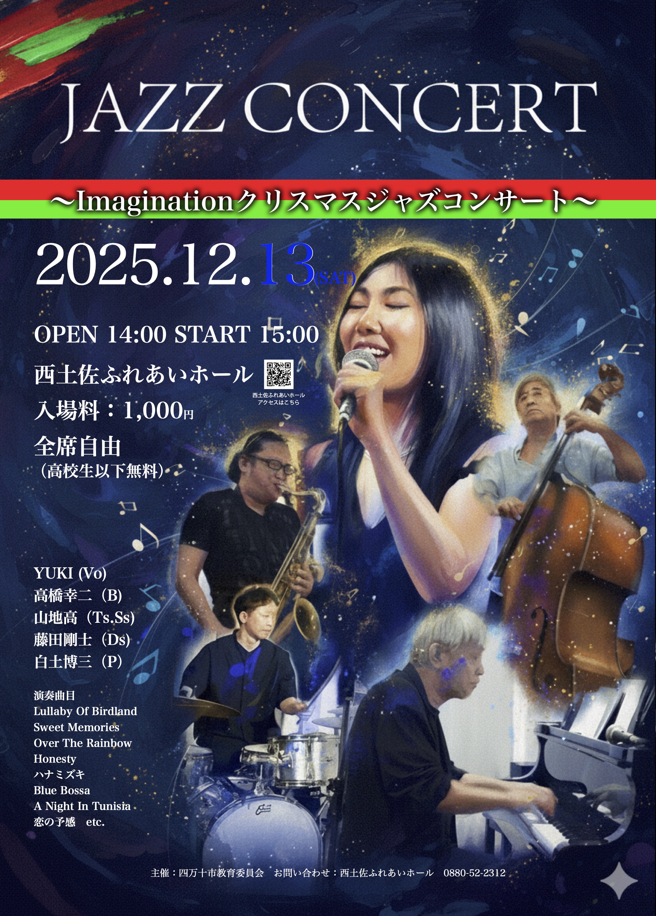 県内外で活動するジャズグループ「Imaginationt」を西土佐ふれあいホールに迎え、ジャズコンサートを開催します。お誘いあわせの上、ぜひご来場ください。