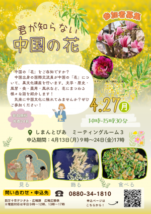 中国出身の国際交流員が、梅・牡丹・桃・菊など、中国人にとって特別な意味をもつ花たちについて、文化や歴史、昔話や食べ方の楽しみ方まで、幅広くお話します!
